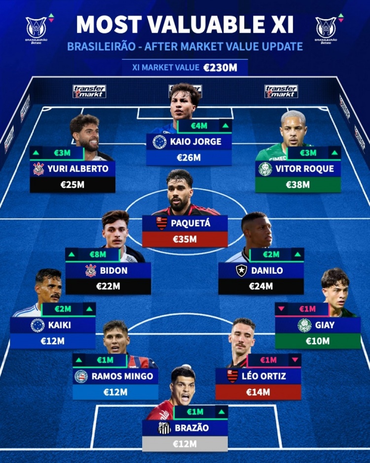 3月13日讯 德国转会市场公布了新一期巴甲球员身价情况,同时评选出了最贵阵,罗克、帕奎塔领衔。